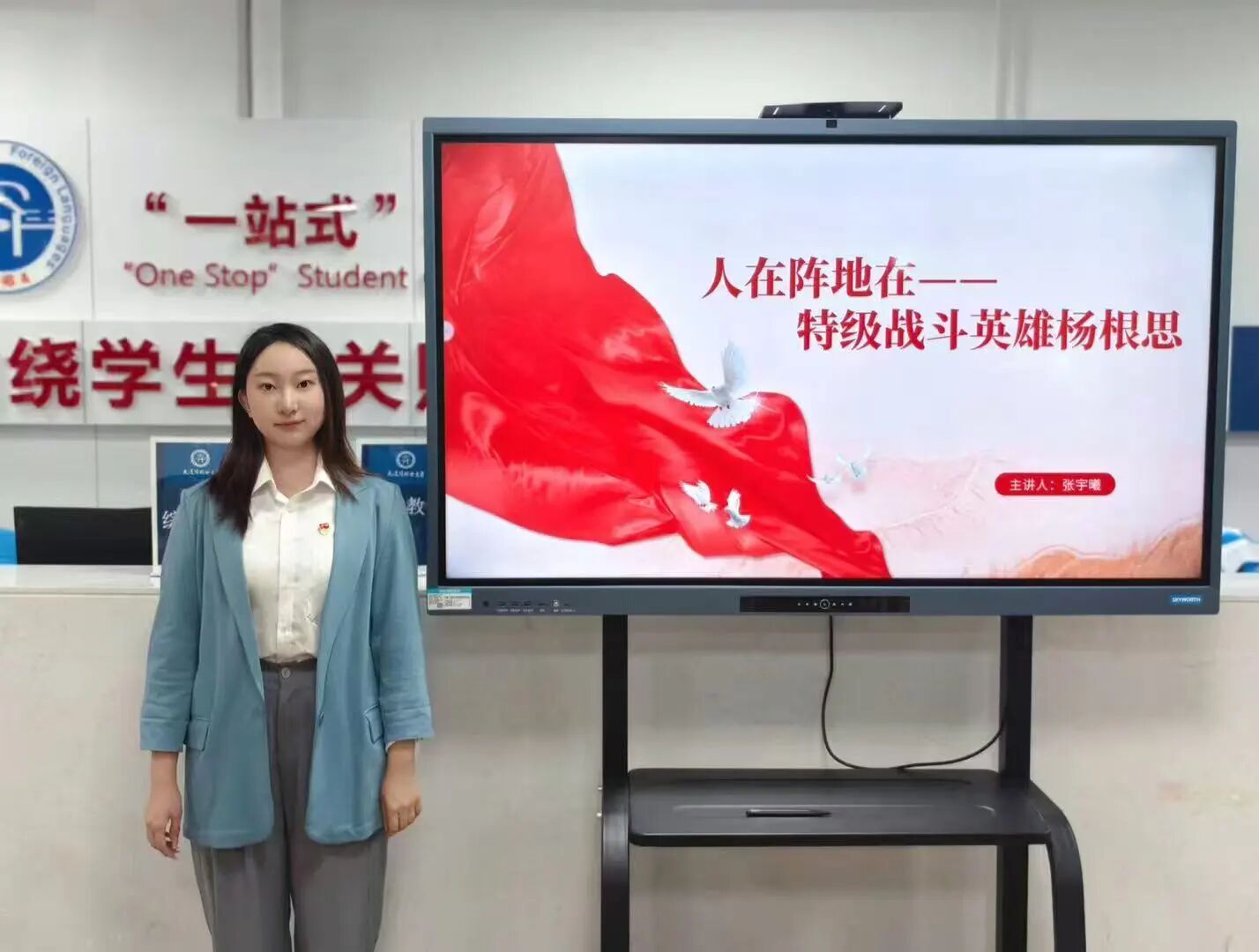 张宇曦同学以“人在阵地在”为主题,向同学们讲述了抗战英雄杨根思的故事。1950年11月,杨根思所在中国人民志愿军抵达朝鲜援助朝鲜战争。在第二次战役中,他率领一个排坚守小高岭阵地,接连击退美军八次反扑。当战斗到只剩他一人时,面对美军来势汹汹的第九次进攻,他毅然抱起炸药包冲向敌群,用生命守住了阵地。小高岭战役的胜利,成功阻止了美军的南逃计划,打乱了“联合国军”的整体部署,对第二次战役东线战场取得胜利起到了至关重要的作用。杨根思在战斗中展现出的不畏强敌、视死如归的革命英雄主义精神,成为了一座不朽的精神丰碑,激励着无数中华儿女为了国家和人民的利益,奋勇拼搏、无私奉献。此后,“杨根思”连一直传承和弘扬着杨根思的精神,在保家卫国、建设祖国的征程中不断书写新的篇章。